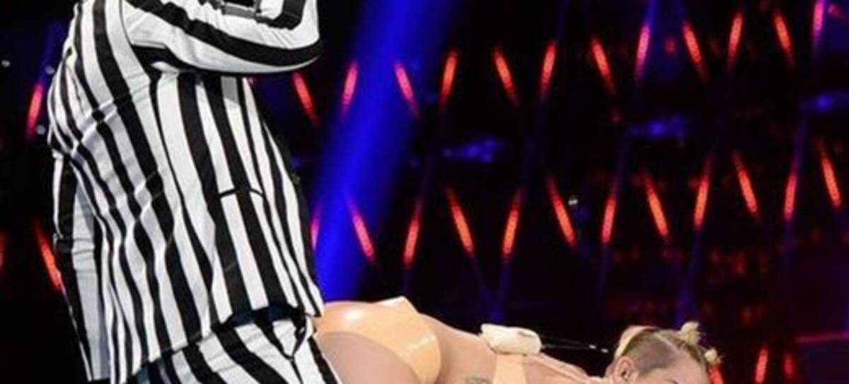 Todo partió bien. Miley subió al escenario con un corset de brillantes, acompañada de humanos con cabezas de osos gigantes. Cantó "We Can’t Stop", el primer single de su próximo disco, y luego apareció quién iba a apoyarla con otro temón, Robin Thicke. Aquí hubo un giro en 180°. Miley comenzó a bailarle con todo el estilo del twerking al cantante de "Blurred Lines". Y si a eso le sumas varios "pato yáñez" y lengüetazos a un dedo de guante de espuma, tienes la imagen final de la presentación de Miley.