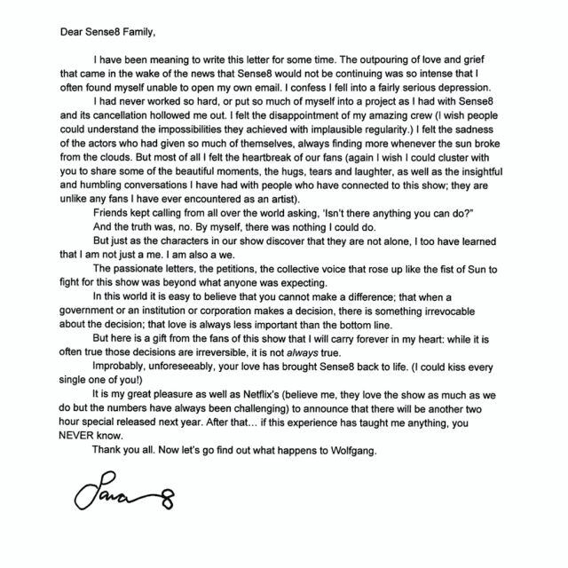 La noticia la dio Lana Wachowski, la co-creadora del programa, a través de una carta: «Hay un regalo de los fanáticos de esta serie, que siempre guardaré en mi corazón: aunque a menudo es cierto que estas decisiones son irreversibles, no siempre es verdadero. Es un gran placer para mí y para Netflix (créanme, ellos aman el show tal como nosotros, pero los números siempre han sido un desafío) anunciar que habrá un nuevo especial de dos horas que se estrenará el próximo año. Después de eso… si esta experiencia me ha enseñado algo, uno NUNCA sabe», fue parte de lo que escribió.