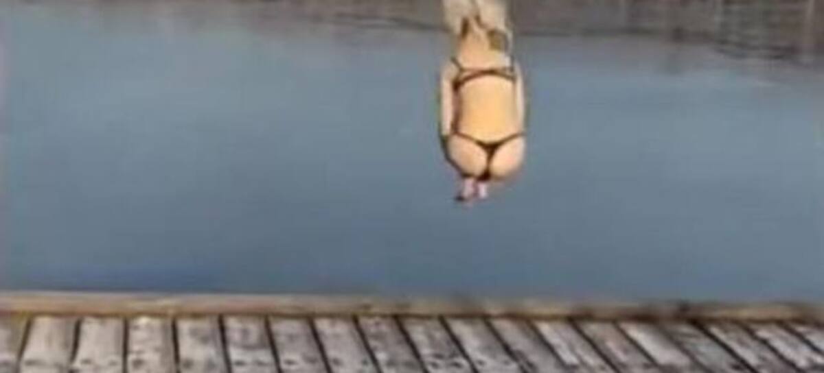 En un video compartido en YouTube, se puede ver cuando la chica corre en ropa interior hacia el lago y se lanza dispuesta a darse un chapuzón, pero se da un fuerte golpe en el hielo.