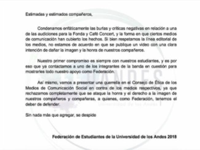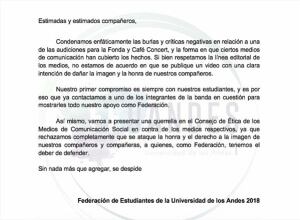 Ante esto, la Federación de Estudiantes de la Universidad de Los Andes anunció mediante un comunicado que interpondrá una querella en el Consejo de Ética de los Medios de Comunicación por las burlas a la banda de rock La Dieta del Lagarto.