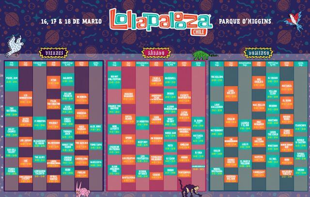 ¡Falta muy poquito! Y Lollapalooza Chile ya ha definido los horarios de las más de 100 presentaciones que se ofrecerán en el Parque O’Higgins durante los días 16, 17 y 18 de marzo. Como era de esperarse, Pearl Jam, Red Hot Chili Peppers y The Killers serán los encargados de cerrar cada una de las jornadas de festival.