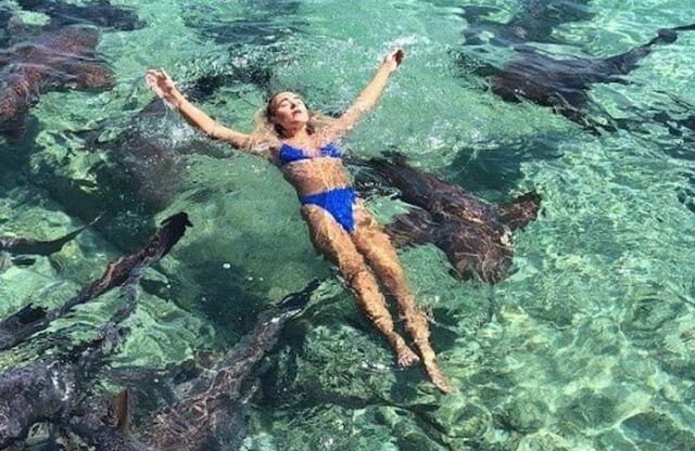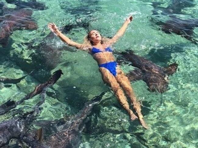 Esto sucedió en Bahamas, cuando la joven le pidió a su novio un par de fotografías entre los escualos que se encontraban a las orillas de una playa.