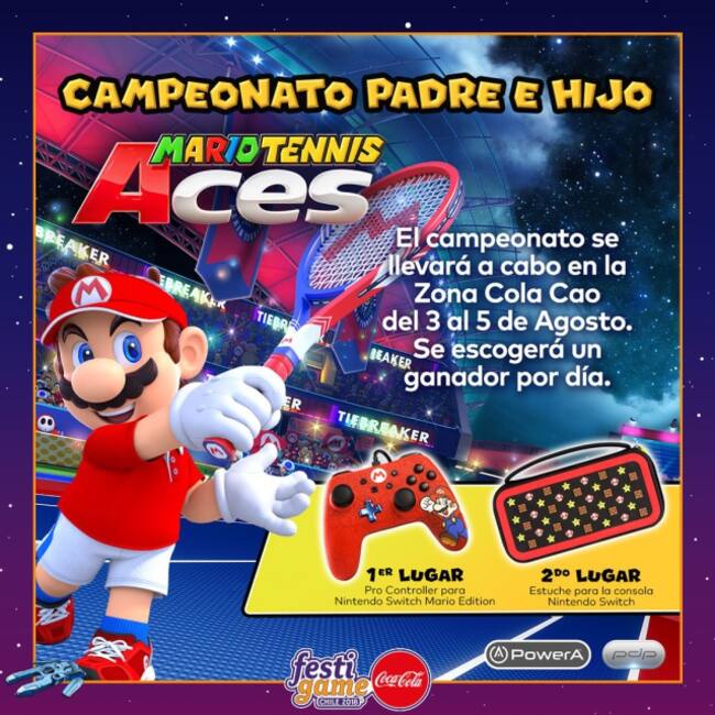 Participa en el torneo Padre e Hijo de «Mario Tennis Aces» en la Zona Kids Cola Cao de FestiGame Coca-Cola y gana. Todos los días tendremos competencias y ganadores.