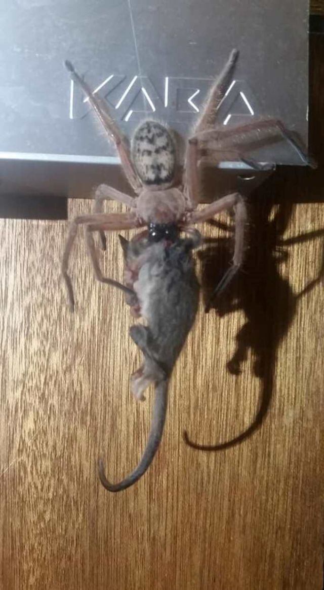 Su esposa Justine Latton publicó a través de Facebook unas imágenes donde una enorme araña cangrejo devoró una zarigüeya pigmea. Es más, en cosa de minutos la tragó.