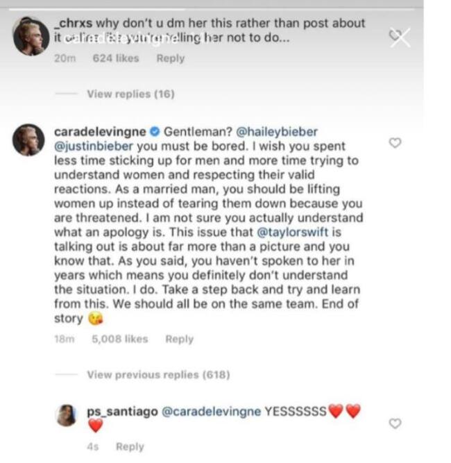 A propósito del respaldo que realizó Justin Bieber a su representante Scooter Brawn respecto de la compra de derechos de las canciones de Taylor Swift, la amiga de la estadounidense, Cara Delevingne, salió en su defensa y comentó dicha polémica publicación original.