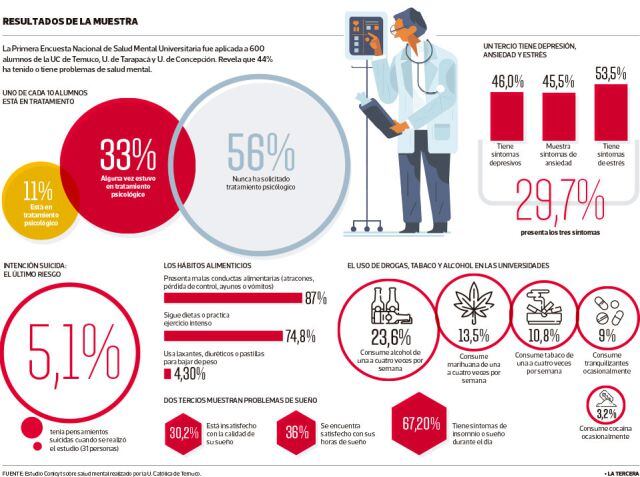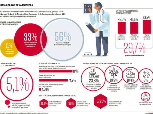La Encuesta Nacional de Salud Mental Universitaria, realizada por la Psicóloga Ana Barrera, en conjunto con Conicyt y aplicada al plantel de la Universidad Católica, además de universidades de Concepción y Tarapacá, reveló que el 46% de los alumnos reconoce tener síntomas de depresión.