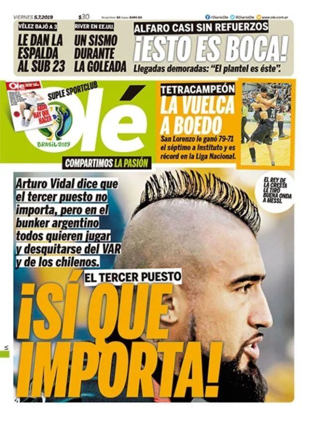 “Arturo Vidal dice que el tercer puesto no importa, pero en el bunker argentino todos quieren jugar y desquitarse del VAR y de los chilenos”, añade la portada del medio.