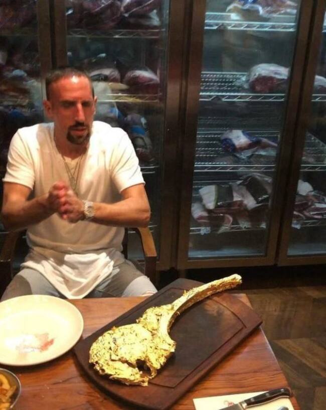 ¿Te imaginas un bistec bañado en oro? Eso es precisamente lo que está preparando un chef turco en Dubai llamado Nusret Gökçe. El cocinero conocido por ofrecer preparaciones a precios escandalosos, creó este bistec bañado en polvo de oro de 24 quilates y que cuesta 472 euros, unos 360 mil pesos chilenos. Este plato obviamente ha atraído la atención de muchos famosos, sin ir más lejos, hace una semana lo visitó el futbolista de Bayern Munich, Franck Ribery, quien tuiteó lo siguiente: