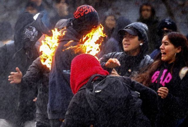 Dos encapuchados terminaron quemados tras explotarles una bomba molotov en la marcha de docentes y estudiantes convocada para este jueves por el Colegio de Profesores.