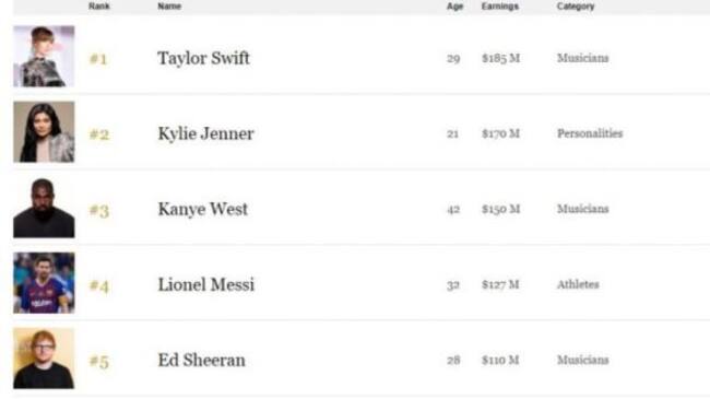 En el ranking aparecen los nombres de Kanye West, Ed Sheeran y Lionel Messi quienes se encuentran en el top 5 junto a Swift y Jenner.