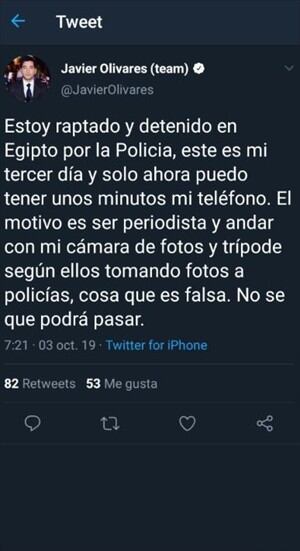 El periodista Javier Olivares, quien estaba trabajando como corresponsal para Canal 13, denunció en Twitter haber sido víctima de un secuestro por parte de la policía de Egipto.
