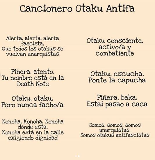 Ahora, en torno a la llamada «Última gran marcha del año», la página Brigada Otaku Antifascista decidió compartir un cancionero que contiene ocho cánticos de protesta para cantar en la calle, donde algunos hacen referencia a «Naruto» y «Death Note», además de otros más genéricos.