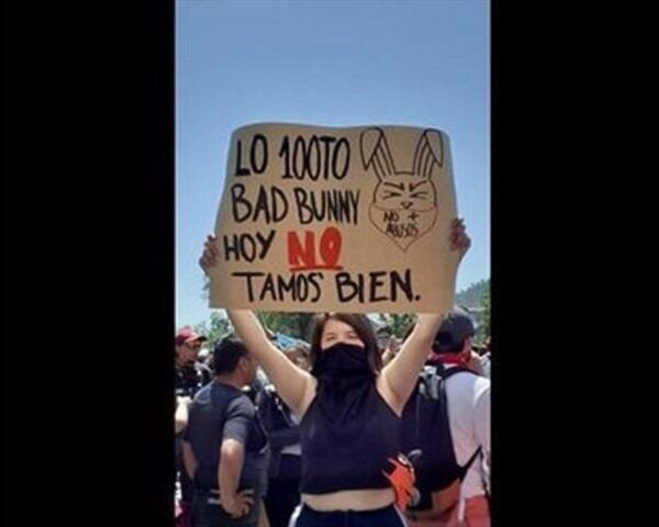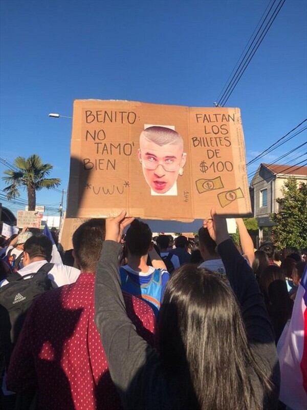 Puede ser que Bad Bunny se haya referido a la situación de descontento social que vive Chile recién hace un día. Sin embargo, su figura y simbolismos ya estaban marcando presente en las manifestaciones en forma de carteles.