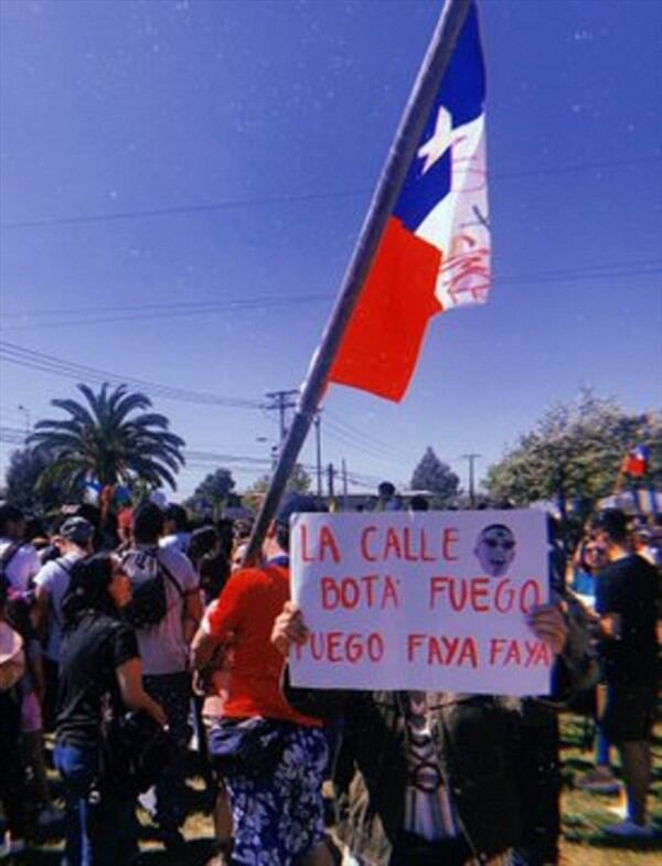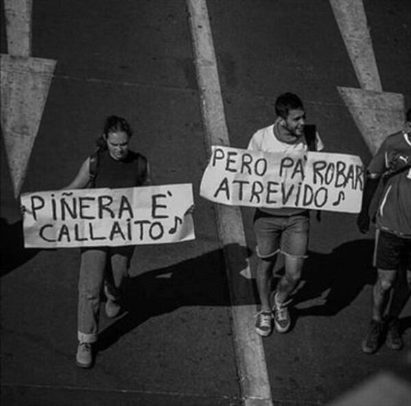 «Piñera e’ callaíto, pero pa’ robar atrevido», dice una de estas pancartas inspiradas en temas de Bad Bunny.