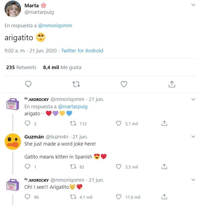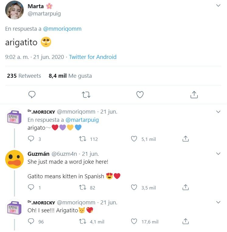 Dr. Moricky subió un nuevo dibujo y una usuaria llamada Marta le respondió “arigatito”, haciendo un juego de palabras entre “arigato” (gracias en japonés) y gatito, lo que le encantó.