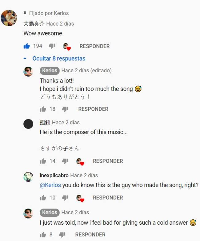 “Al tener un canal de covers de anime, estoy acostumbrado a recibir comentarios en japonés. Al no saber mucho del idioma aplico traductor y sentido común, así que cuando llegó el comentario de Ryosuke Oshima no caché”, comenzó diciendo.