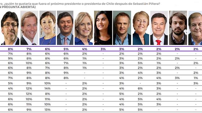 La médica se ubica en el sexto lugar de preferencias con un 3 %. Los primeros lugares están conformados por Joaquín Lavín (16%), Daniel Jadue (8%), José Antonio Kast (7%) y Beatriz Sánchez (6%).