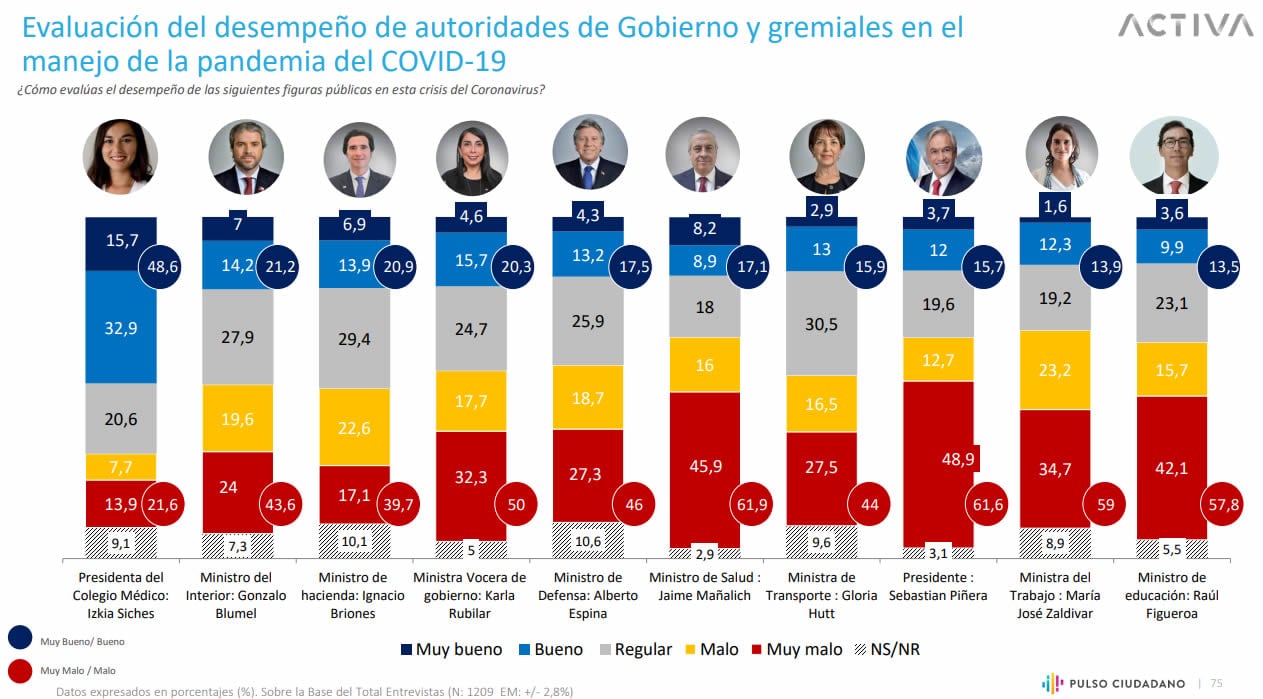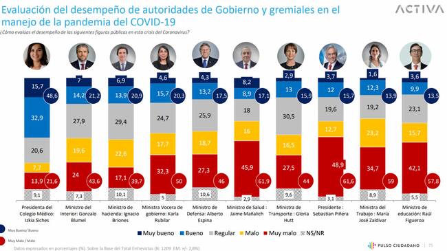 Según publica ADN.cl, la encuesta Pulso Ciudadano de Activa Research informó acerca de la evaluación del desempeño de las autoridades de Gobierno y gremiales, en el manejo de la pandemia del coronavirus Covid-19.