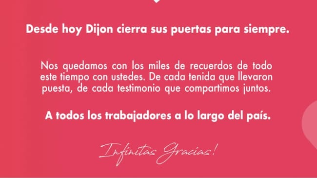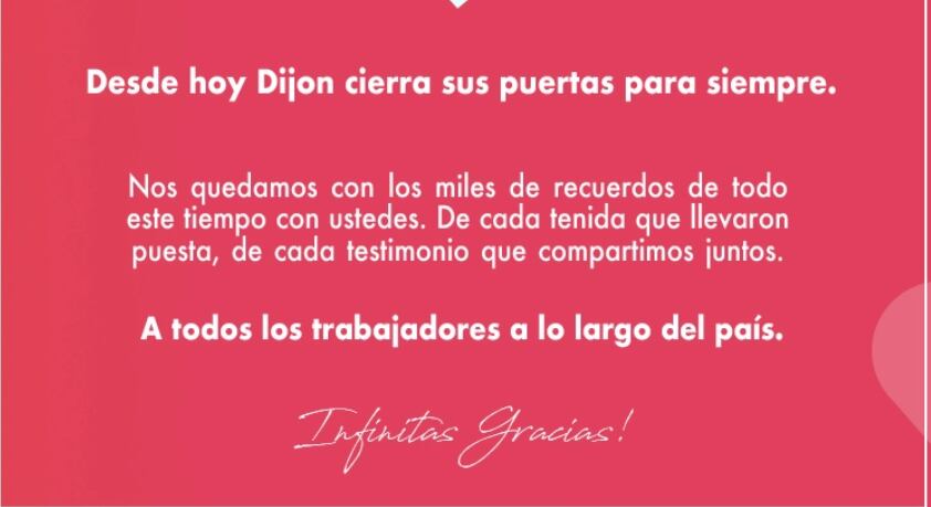 Esto lo comunicaron por medio de un mensaje que aparecía en su página web, donde expresaban que «Desde hoy Dijon cierra sus puertas para siempre. Nos quedamos con los miles de recuerdos de todo este tiempo con ustedes. De cada tenida que llevaron puesta, de cada testimonio que compartimos juntos”, además de enviarle un saludo a todos los trabajores.