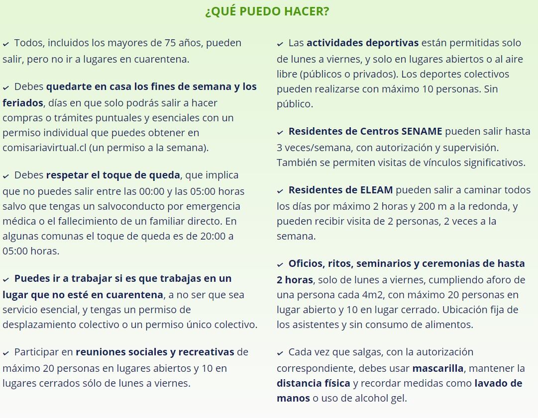 Según el plan dispuesto por el Minsal, las comunas en Fase 2 etapa de transición deberán permanecer en cuarentena durante los fines de semana y feriados, días en que solo podrás salir a hacer compras o trámites puntuales y esenciales con un permiso individual que se puede obtener comisariavirtual.cl.