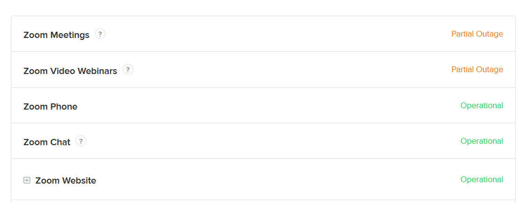 Hasta el momento, la compañía propietaria de Zoom no ha reportado anomalías en su servicio, pero diversas páginas que funcionan a partir de reportes de usuarios dan cuenta de caídas parciales en los servicios de Webinars y reuniones.