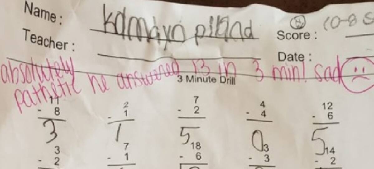 El alumno tenía que responder 60 ejercicios matemáticos en 3 minutos, pero solamente pudo hacer 13. Tras esto, la profesora le dejó un cuestionable mensaje