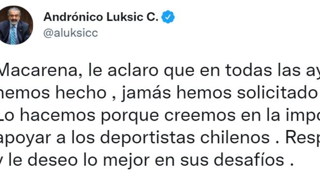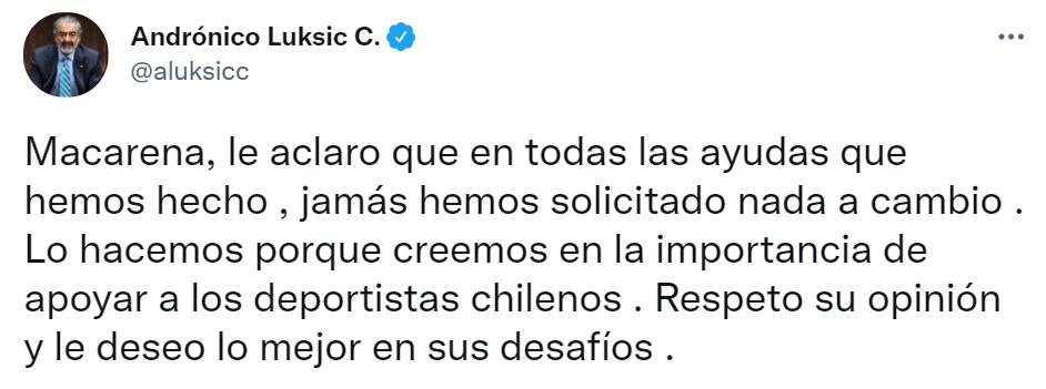 “Macarena, le aclaro que en todas las ayudas que hemos hecho, jamás hemos solicitado nada a cambio. Lo hacemos porque creemos en la importancia de apoyar a los deportistas chilenos. Respeto su opinión y le deseo lo mejor en sus desafíos”, expresó.