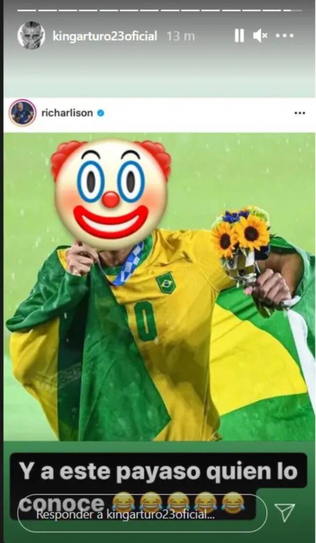 SIn embargo, el duelo entre Arturo Vidal y Richarlison no quedó ahí, puesto que el medio campista del Inter de Milán le contestó subiendo a sus propias historias una foto del delantero del Everton, pero con un emoji de payaso reemplazando su cara.