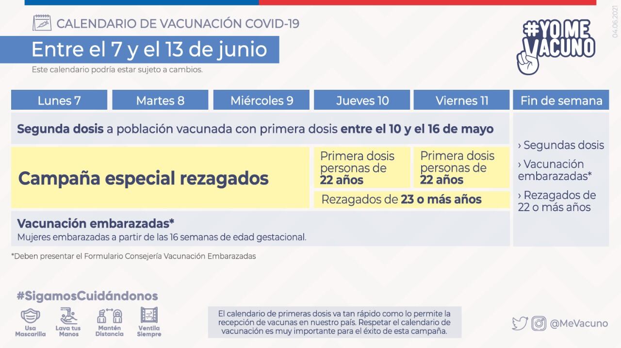 Según el Minsal bajo el programa «Yo Me Vacuno», la dosis del fármaco para esta semana será para el Personal de Transportes y de servicios básicos (electricidad, agua, gas, telecomunicaciones, generación de energía, distribuidores de combustible), así como también los vocales de mesa y personal de apoyo en la elección, como delegados y asistentes de la Junta Electoral y personal del SERVEL que particián en el proceso presentando la credencial o certificado que los acredite.