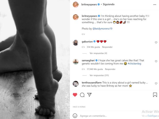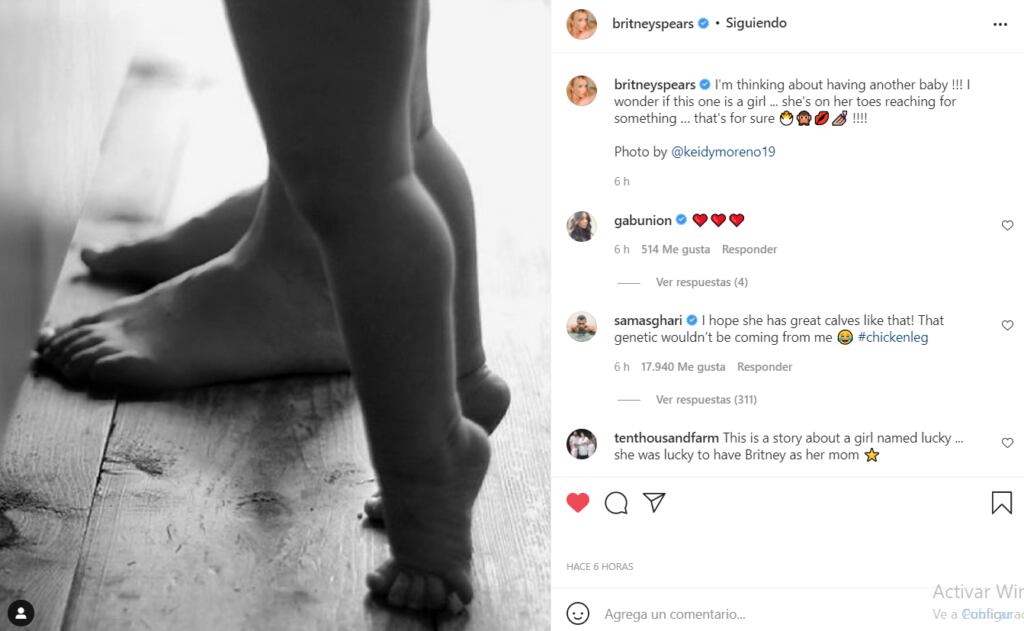 «¡Estoy pensando en tener otro bebé! Me pregunto si esta es una chica… ella está de puntillas buscando algo… eso es seguro», comentó Britney Spears en la foto que contó con un inmenso apoyo por parte de sus seguidores.