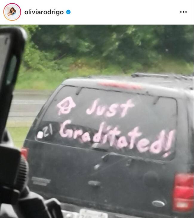Dentro del carrusel posteado en su cuenta de Instagram la intérprete de “Drivers License” aparece en la primera foto haciendo el signo de la paz con sus dedos, para posar haciendo una mueca en la segunda y finalmente publicó una en la que aparecen las letras rosadas “Just Graditated” en la parte trasera de un auto.