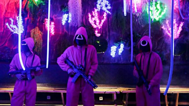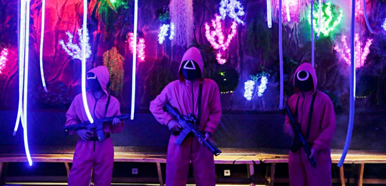 En una sala oscura iluminada con luces de neón, los guardias conducen a los clientes hacia el final de la sala. Allí comienza el juego “luz roja, luz verde”, inspirado en el primer episodio de la serie.