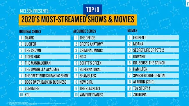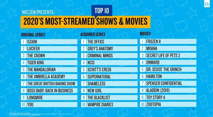 Respecto a las series originales, Netflix consiguió los primeros lugares gracias a «Ozark» con más de 30 mil millones de minutos reproducidos; «Lucifer» (19 mil millones), «The Crown» (16.3 mil millones) y «Tiger King» (15.7 mil millones). En el listado tambien aparece «The Mandalorian» (14.5 mil millones) de Disney+.