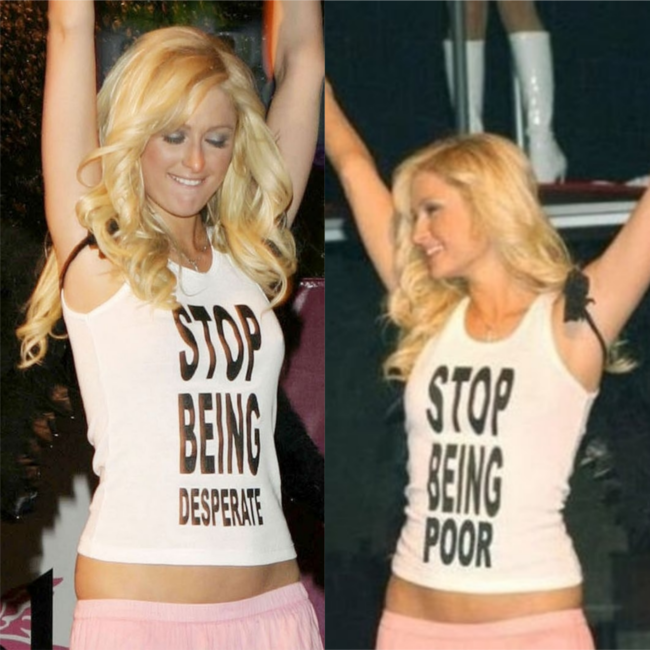 La fotografía fue tomada por el paparazzi, Vince Flores, en el año 2005 mientras la celebridad se encontraba en una fiesta en Las Vegas usando la polera en cuestión. Años después fue photoshopeada y pasó de: “Deja de estar desesperado” a “Deja de ser pobre”.