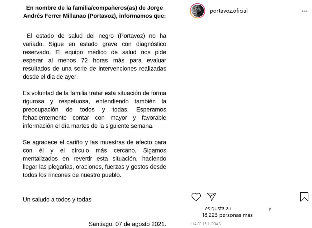 «El estado de salud del negro (Portavoz) no ha variado. Sigue en estado grave y con diagnóstico reservado. El equipo médico nos pide esperar 72 horas más para evaluar los resultados de una serie de intervenciones realizadas desde el día de ayer», dice el mensaje.