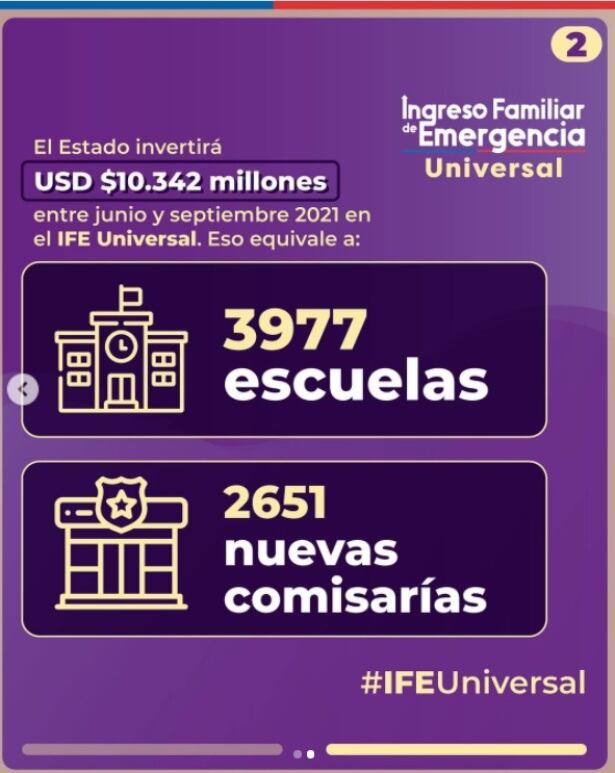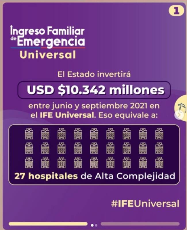 «Porque sabemos que muchas familias han visto perjudicados sus bolsillos a raíz de la pandemia, como Gobierno hemos impulsado el #IFEUniversal, con el fin de brindar un apoyo a miles de chilenos y chilenas», dice el posteo que asegura que el monto invertido por el Estado de más de 10 millones de dólares equivale a 27 hospitales de alta complejidad o casi 4 colegios.