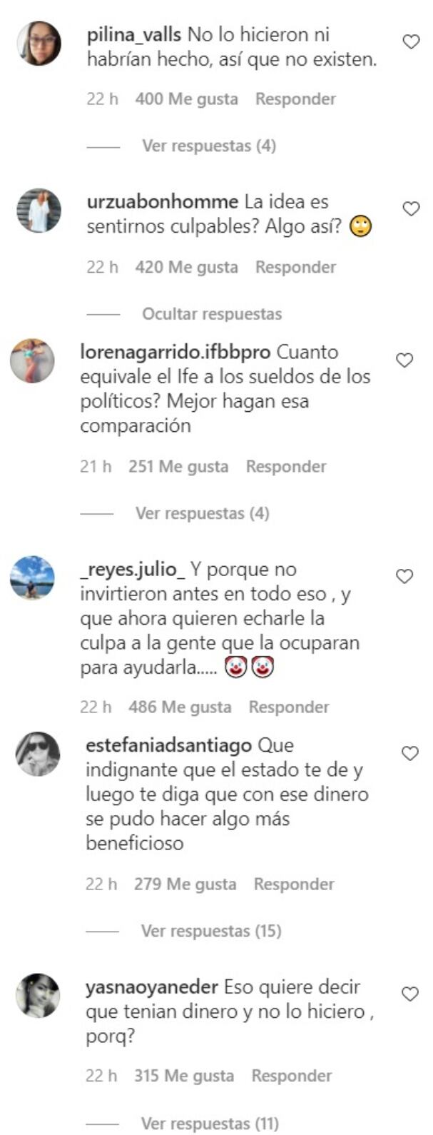 «¿La idea es sentirnos culpables? ¿Algo así?», «No lo hicieron ni habrían hecho, así que no existen», «¿Cuánto equivale el IFE a los sueldos de los políticos? Mejor hagan esa comparación» o «Y por qué no invirtieron antes en todo eso, y que ahora quieren echarle la culpa a la gente que la ocuparan para ayudarla» fueron parte de los comentarios que se pueden leer.