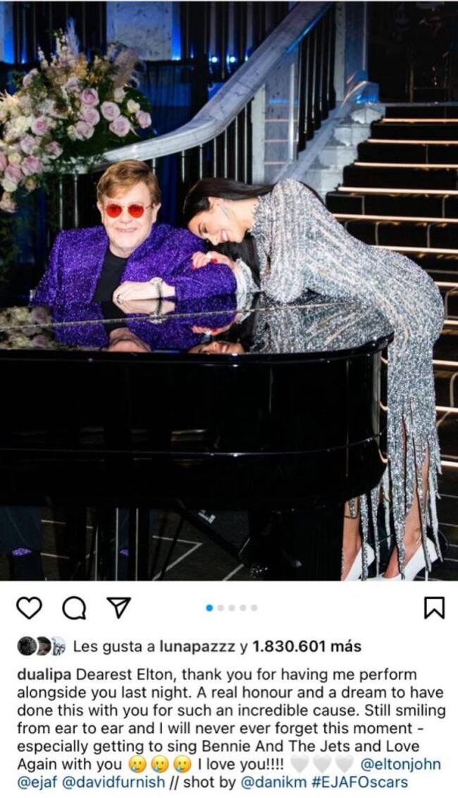 “Queridísimo Elton John, gracias por permitirme actuar a tu lado anoche. Es un verdadero honor y un sueño haber hecho esto contigo por una causa tan increíble. Todavía sigo sonriendo de oreja a oreja y nunca olvidaré este momento”, escribió.