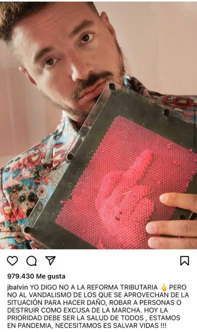 J Balvin también expresó su oposición ante la violencia. El artista utilizó su Instagram y escribió: “Yo digo no a la reforma tributaria, pero no al vandalismo de los que se aprovechan de la situación para hacer daño, robar a personas o destruir como excusa de la marcha. Hoy la prioridad debe ser la salud de todos, estamos en pandemia, necesitamos es salvar vidas”.
