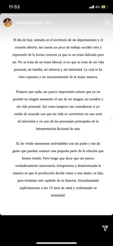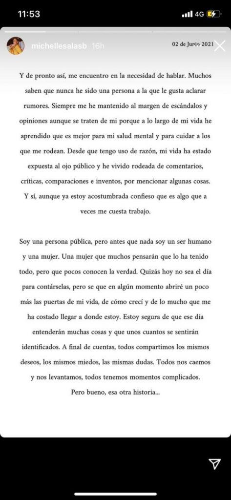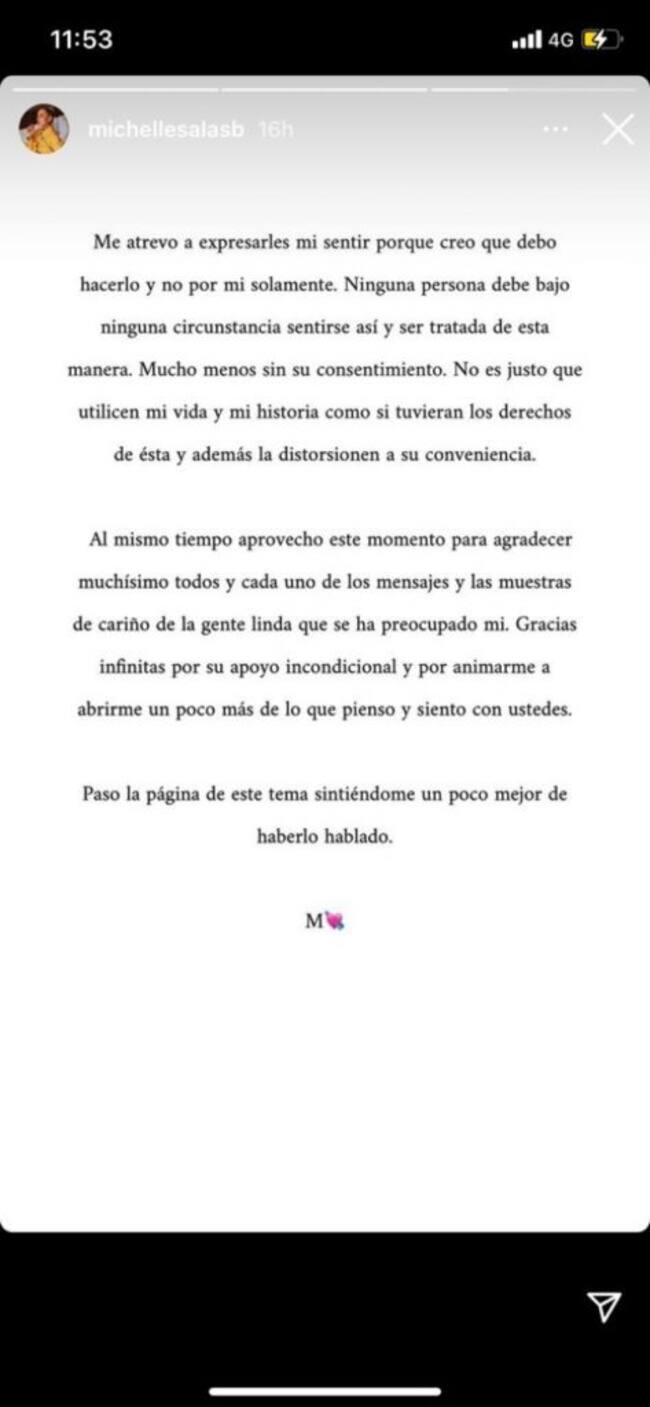 Sin embargo, ahora Michelle se mostró indignada y recurrió a su cuenta de Instagram en la que tiene 1,7 millones de seguidores. La influencer a través de tres imágenes en sus historias emitió un comunicado en el que expresó su opinión al respecto.