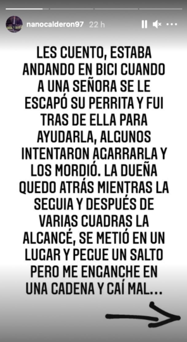 “La dueña quedó atrás mientras la seguía y después de varias cuadras la alcancé. Se metió en un lugar y pegué un salto, pero me enganché en una cadena y caí mal. Finalmente, valió la pena, ya que la perrita tuvo un final feliz dado que se le entregó a su dueña”, añadió Nano Calderón.