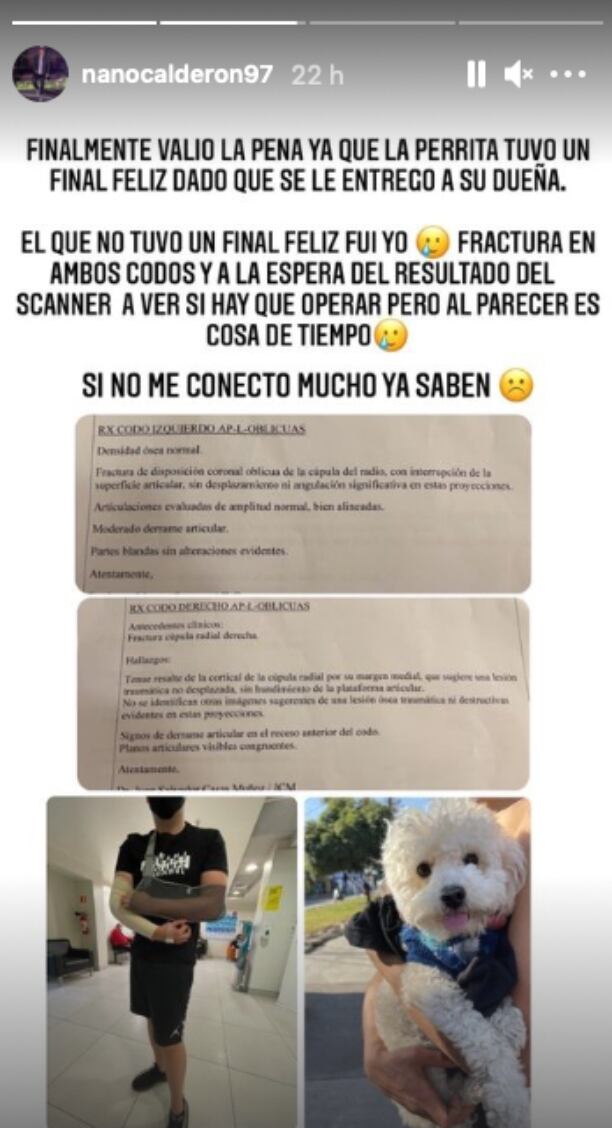 “El que no tuvo un final feliz fui yo", comentó Nano Calderón mostrando fotos de las fracturas en sus brazos tras lo sucedido