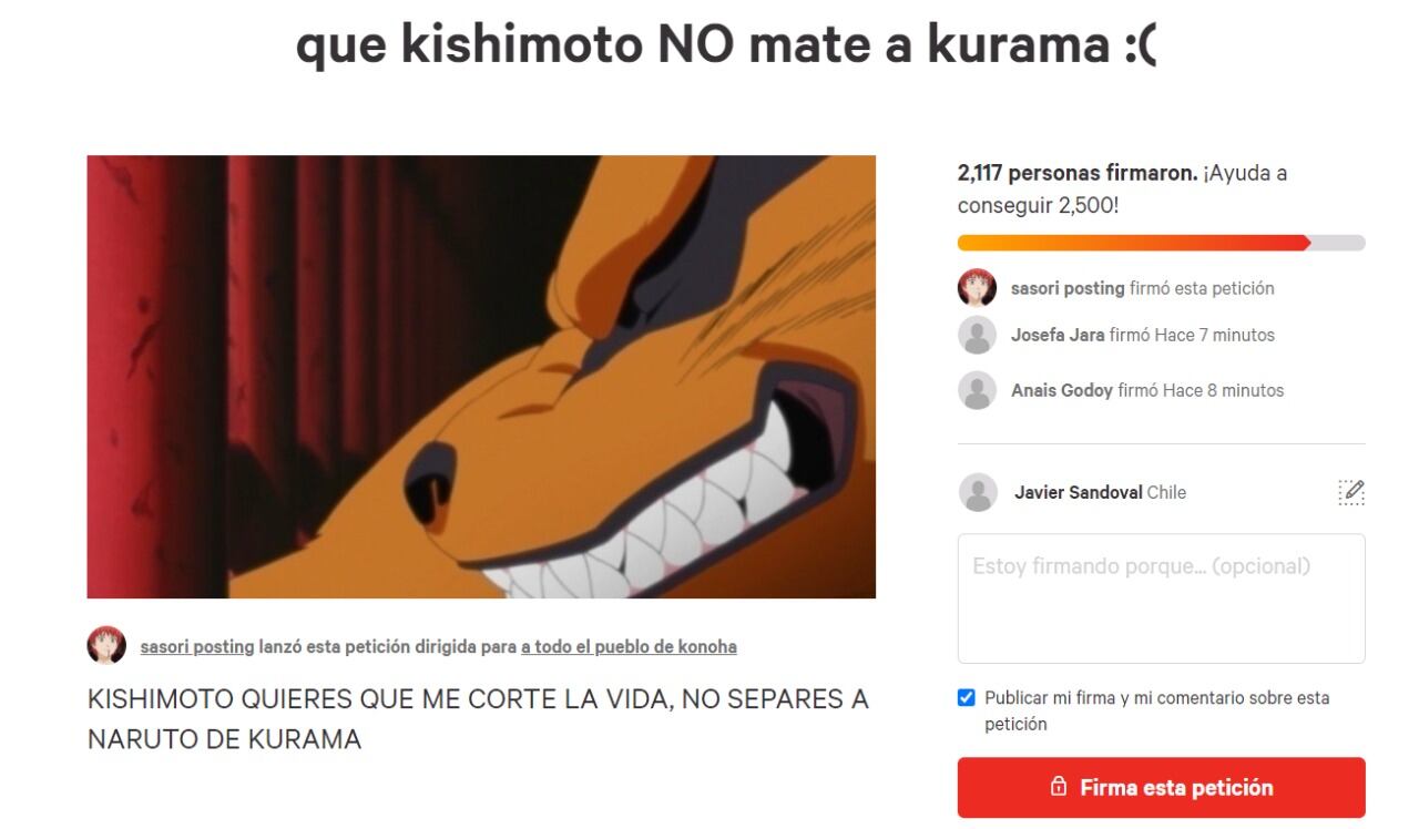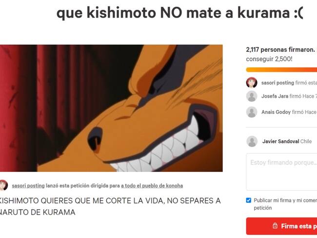 Es más, como si fuera poco la página de memes de anime Sasori Posting (los mismos de una estatua de Naruto en Plaza Italia/Dignidad) inició una campaña en Change.org para que Masashi Kishimoto (mangaka) no mate a Kurama, la que ya suma más de 2 mil firmas. Si quieres formar parte de esta cruzada, haz clic aquí.