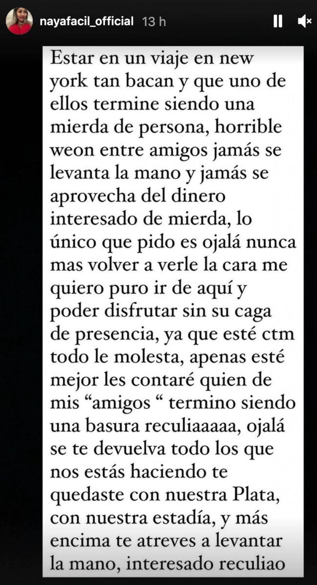«Estar en un viaje en Nueva York tan bacán y que uno de ellos termine siendo una mierda de persona. Horrible weón. Entre amigos jamás se levanta la mano y jamás se aprovecha del dinero interesado de mierda», comenzó escribiendo Naya Fácil.