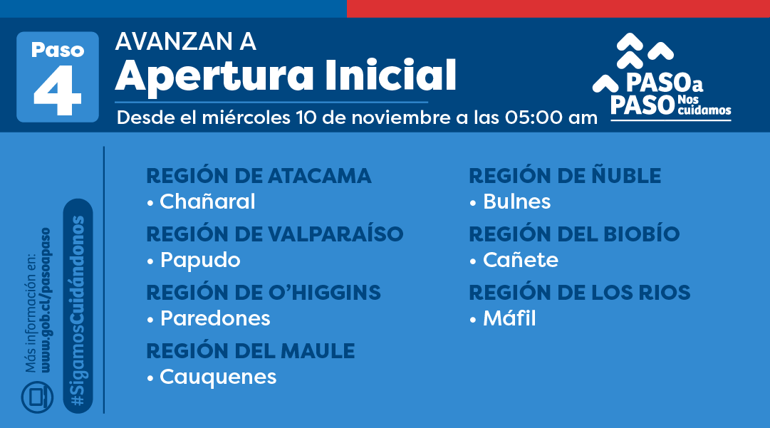Según lo informado por el Minsal, seis comunas avanzarán a la Fase 4, de Apertura Inicial: Chañaral, Papudo, Paredones, Cauquenes, Bulnes, Cañete y Máfil.