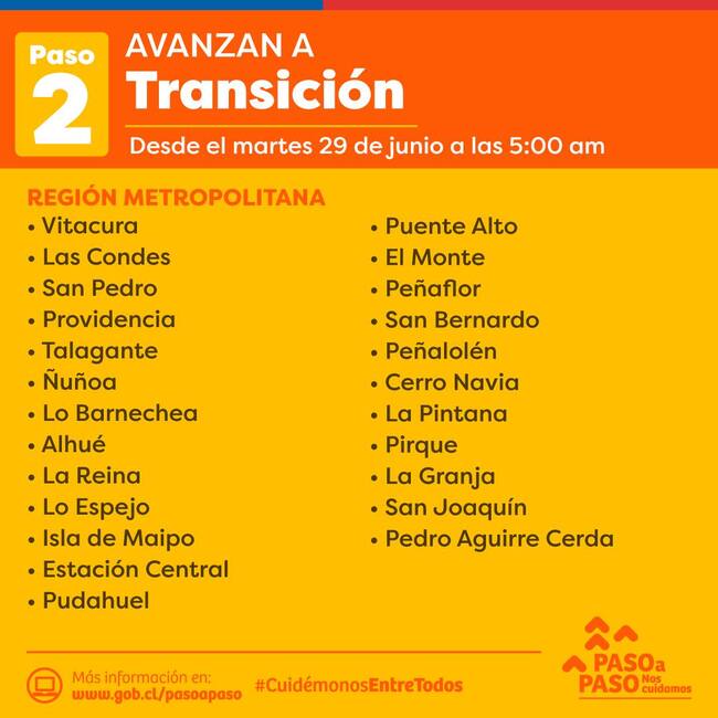 En cambio, las comunas que avancen verán efectivo el cambio desde el martes 29 de junio a la misma hora.
