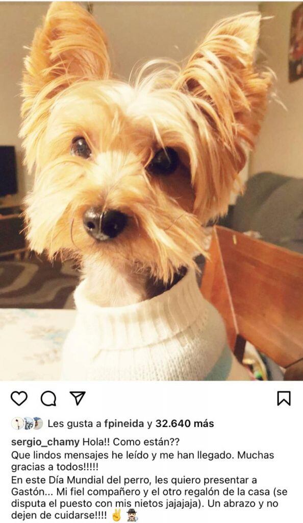 A través de su cuenta de Instagram Chamy publicó una foto de su regalón en la que se puede ver al peludo usando un chaleco blanco y mientras mira fijamente a la cámara.