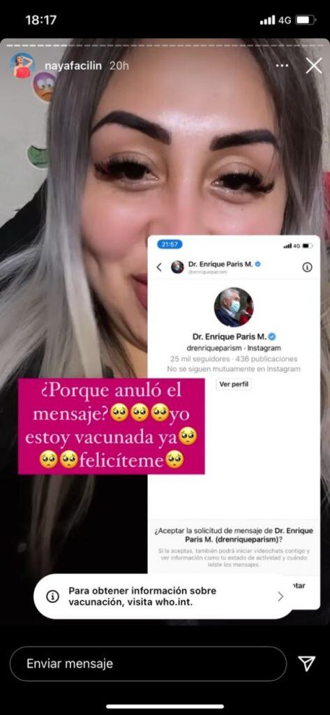 “Chiquillos a que no saben quien me habló. Adivinen. No, Bad Bunny no es, todavía sigo esperando que me hable. Les voy a dejar el pantallazo de quien me habló, pero anuló el mensaje. Nuestro ministro de Salud”, relató Naya en Instagram.