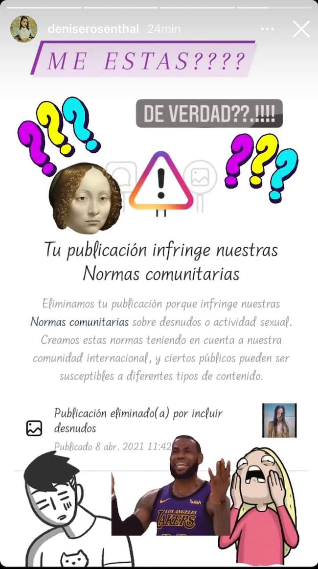 Esta eliminación de contenido fue denunciada por la misma Denise Rosenthal, quien subió a sus stories una captura del mensaje que le llegó tras haber subido el post.