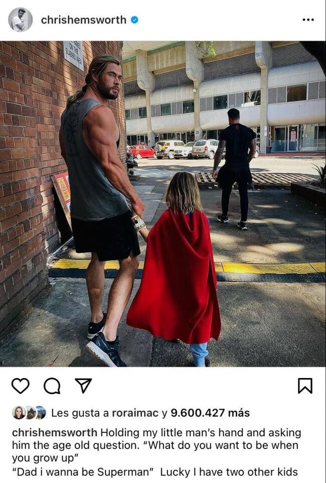 Hemsworth compartió este lunes una foto en su cuenta de Instagram en la cual aparece él con la característica cabellera de Thor sosteniendo la mano de uno de sus hijos, quien aparece usando ¡una capa roja!